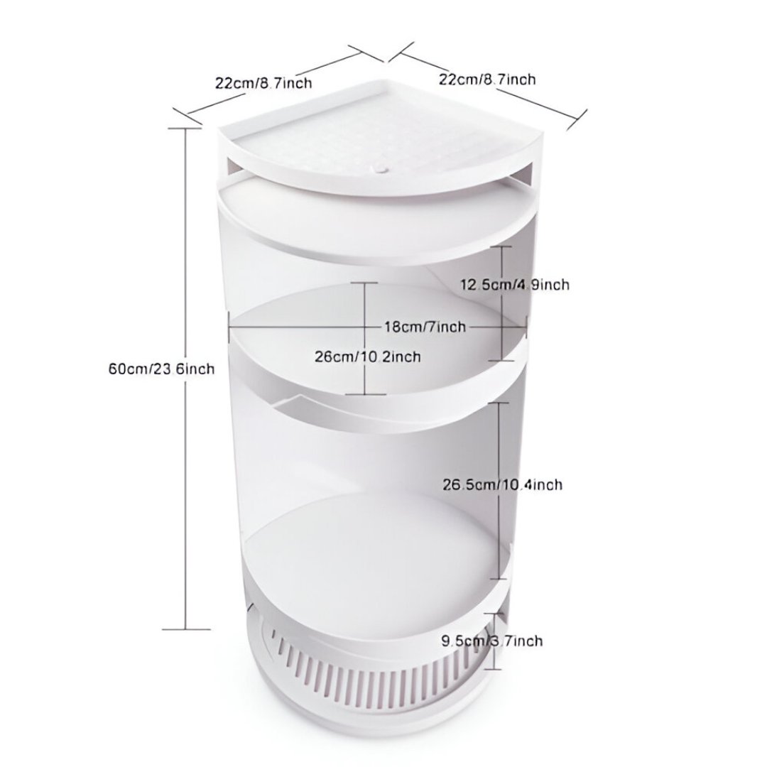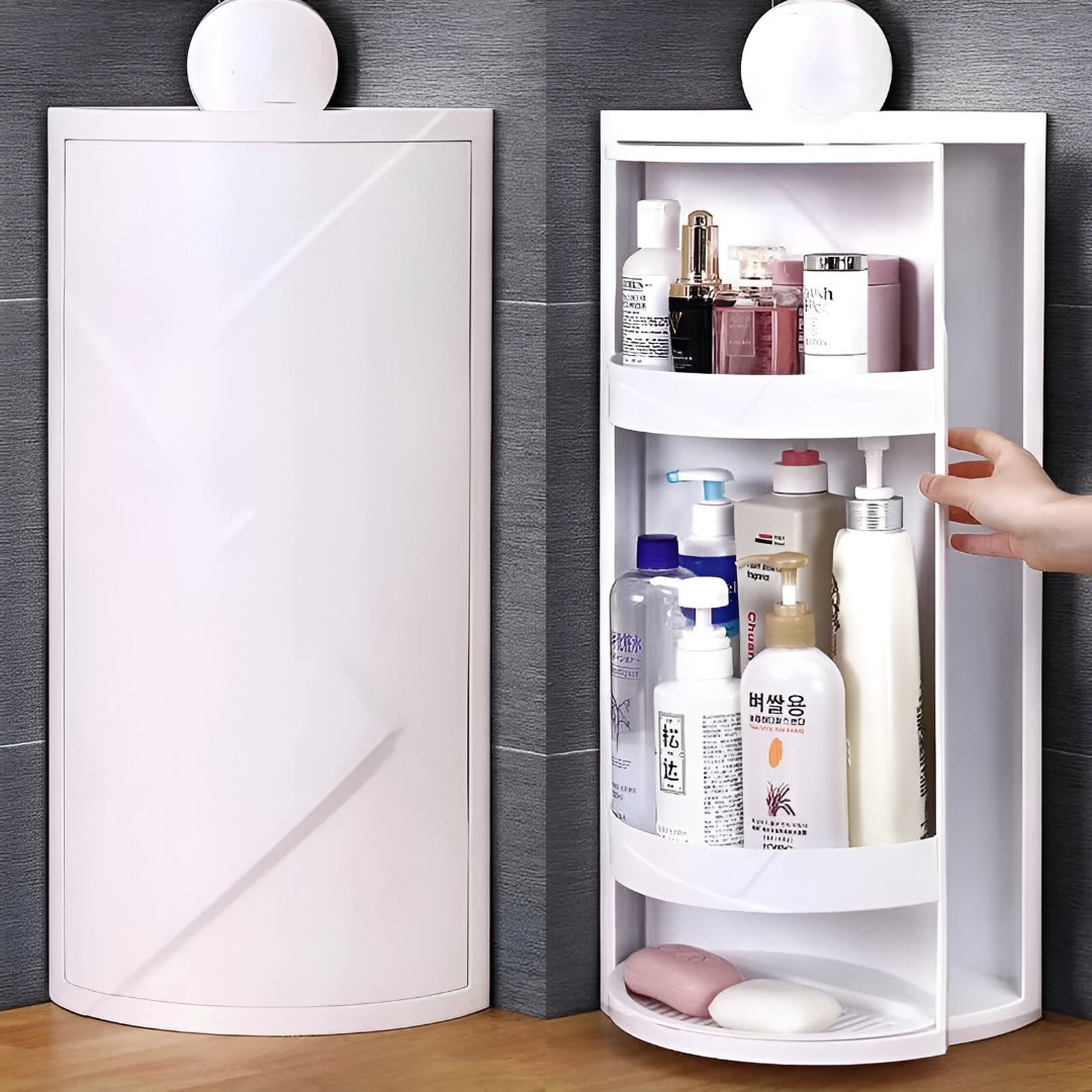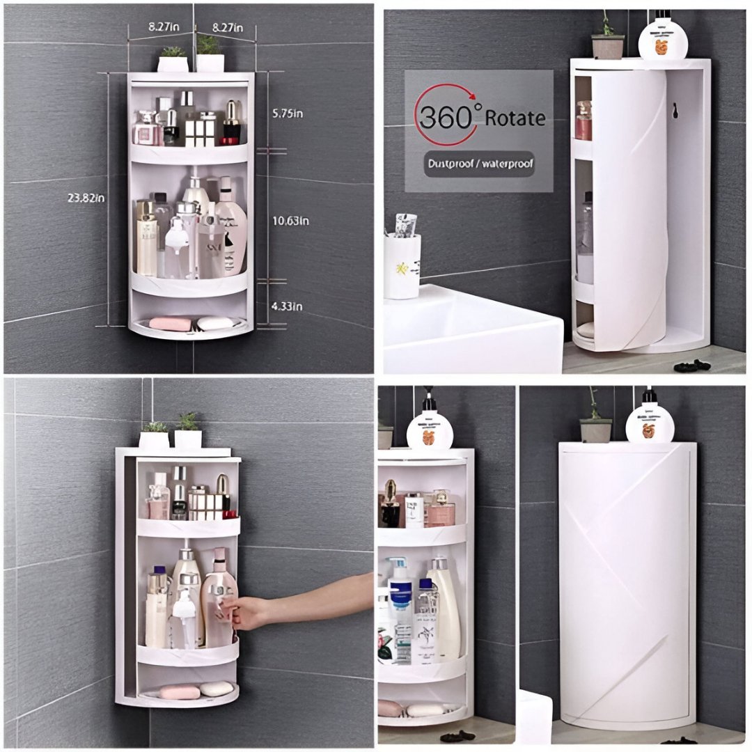 This 360° Rotating Corner Bathroom Cabinet is a smart storage solution for small spaces. Designed to fit perfectly in bathroom or kitchen corners, it offers a sleek, modern look with hidden storage behind a rotating door. With multiple layers, it keeps your essentials organized and easily accessible. Wall-mounted and space-saving, it is ideal for storing toiletries, cosmetics, or kitchen items. Made from durable plastic, it’s waterproof, dustproof, and easy to clean.