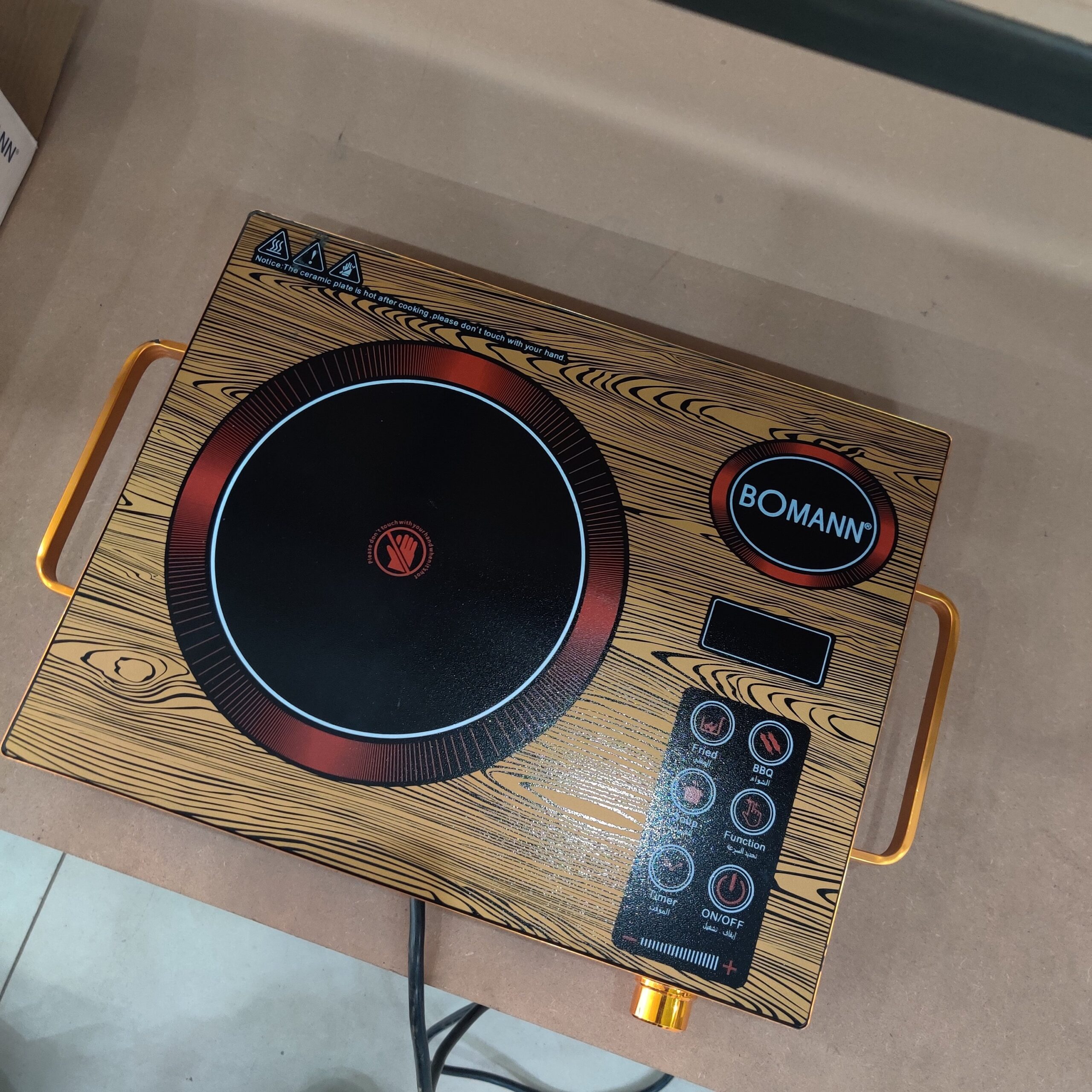 With a wooden-color body and black tempered glass top, this hob brings a touch of class to your countertop. Its compact size (L 43 × W 32 × H 5 cm) and lightweight build (2 kg) make it portable and easy to store — ideal for small spaces or travel cooking.