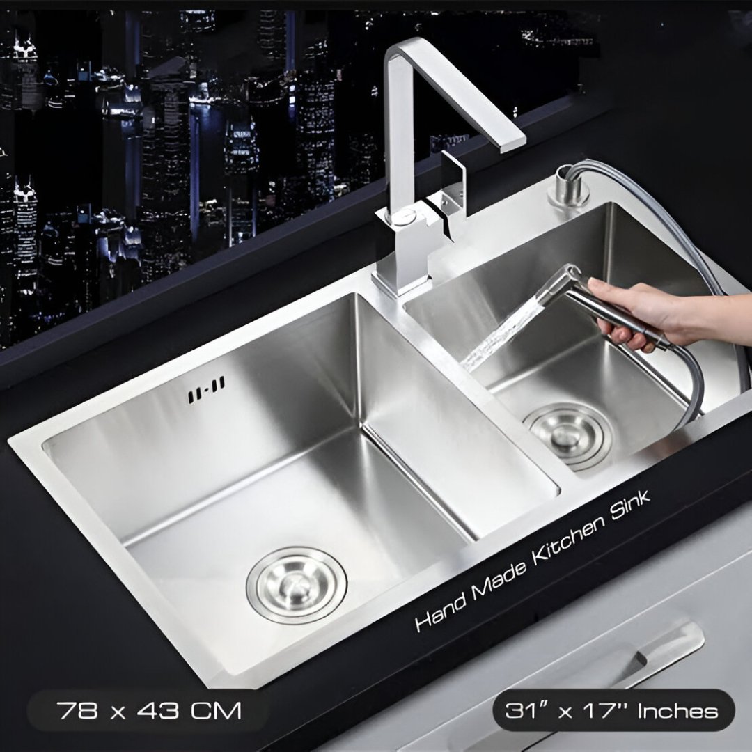 Bring elegance and durability to your kitchen with the 78×43 cm Double Bowl 304 Stainless Steel Kitchen Sink. Made from high-quality 304-grade stainless steel, this sink is rust-proof, scratch-resistant, and easy to maintain, ensuring long-lasting performance.